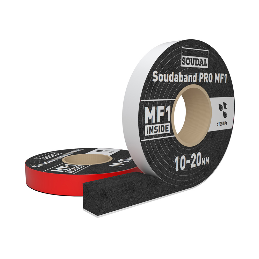 Soudaband PRO MF1 es una cinta precomprimida multifuncional para para el sellado de juntas, que cumple los nuevos requisitos de la norma DIN 18542:2020 MF1. Realiza los 3 niveles del sistema profesional de sellado de juntas en un solo producto: impermeabilidad a la lluvia hasta 1050 Pa en el exterior, buen aislamiento térmico y acústico en el centro y estanqueidad al aire en el interior de la junta. Soudaband PRO MF1 garantiza un sellado duradero para la carpintería exterior en múltiples niveles.